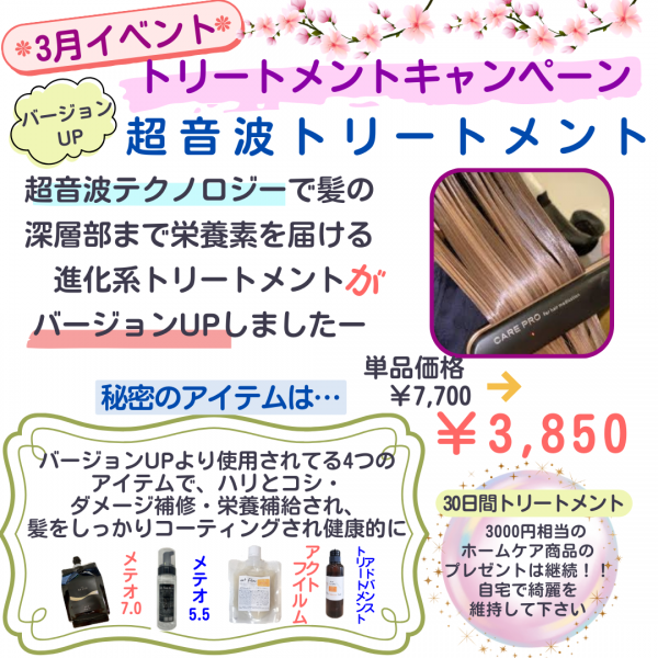 | 2026.02.28 3月イベント 3月イベントの開催です すっかり温かくなってきましたねー 春です☆ 春は、イベントが沢山ある季節!! 様々な場面でヘアースタイルが決まらないと、気分が上がらないですよね ... | ![]() |