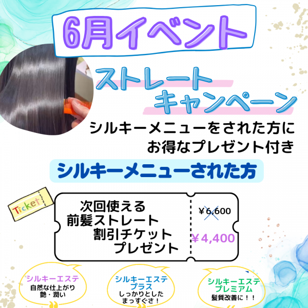 「髪質改善シルキーエステ」のメニューをされたい方に、次回使える、「前髪ストレート割引チケット」をプレゼント!