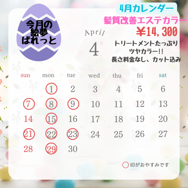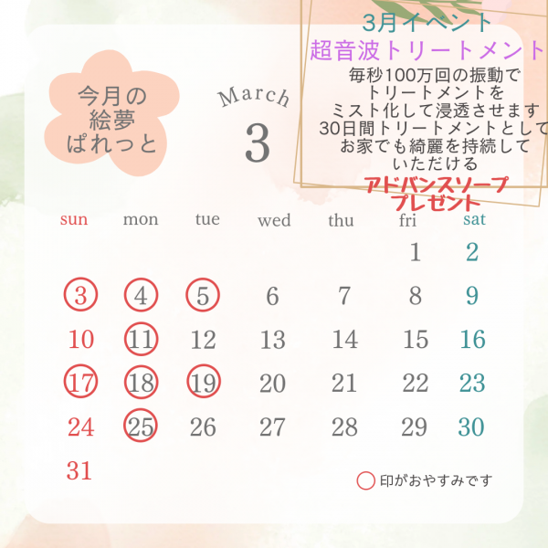30日間トリートメントっとしまして、お家でも綺麗を持続していただきたく、絵夢ぱれっとオリジナルシャンプー「アドバンスソープ」(¥3,300)のプレゼント付き!