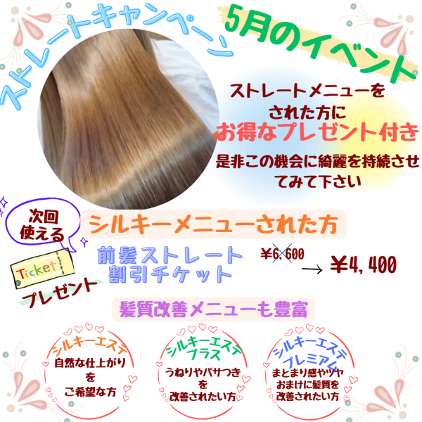 「髪質改善シルキーエステ」のメニューをされたい方に、次回使える、「前髪ストレート割引チケット」をプレゼント!